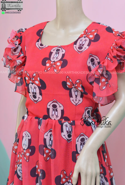 Mickey mouse print red georgette frock..