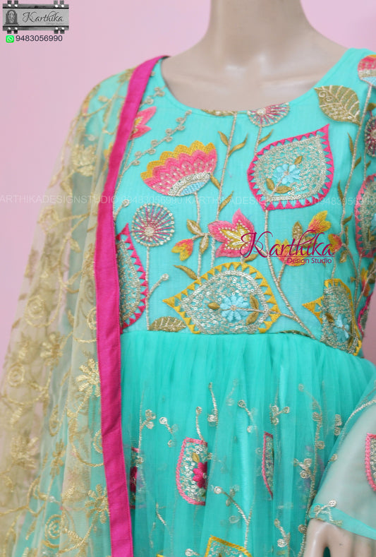 Sea Green embroidered net long gown..