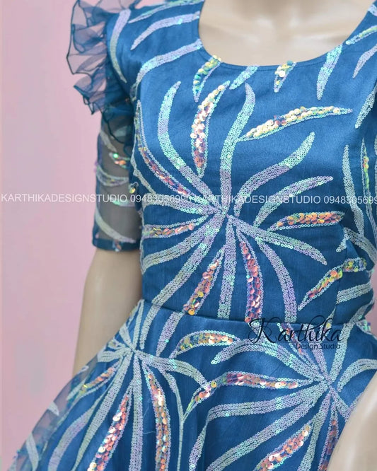 Sold outTeal blue embroidered net frock