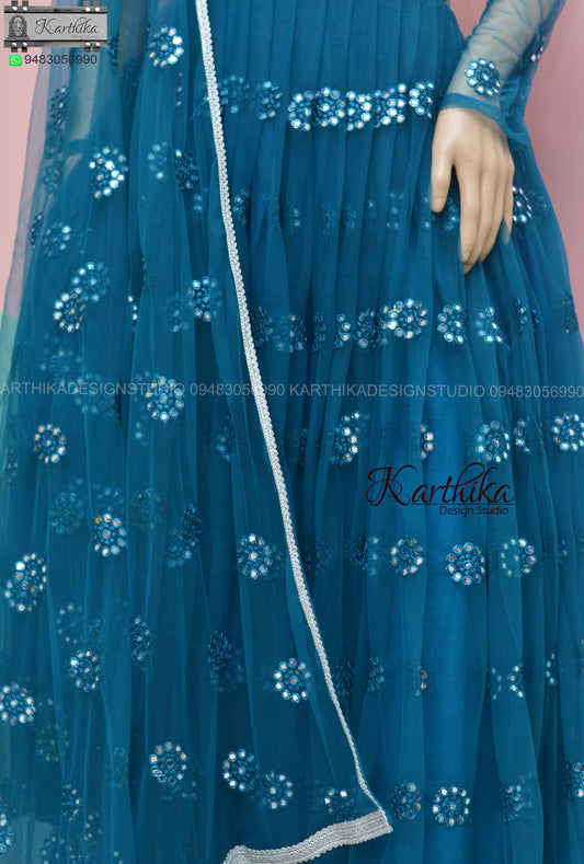 Teal blue embroidered net long gown..