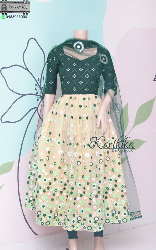 Bottle green embroidered net chudidhar