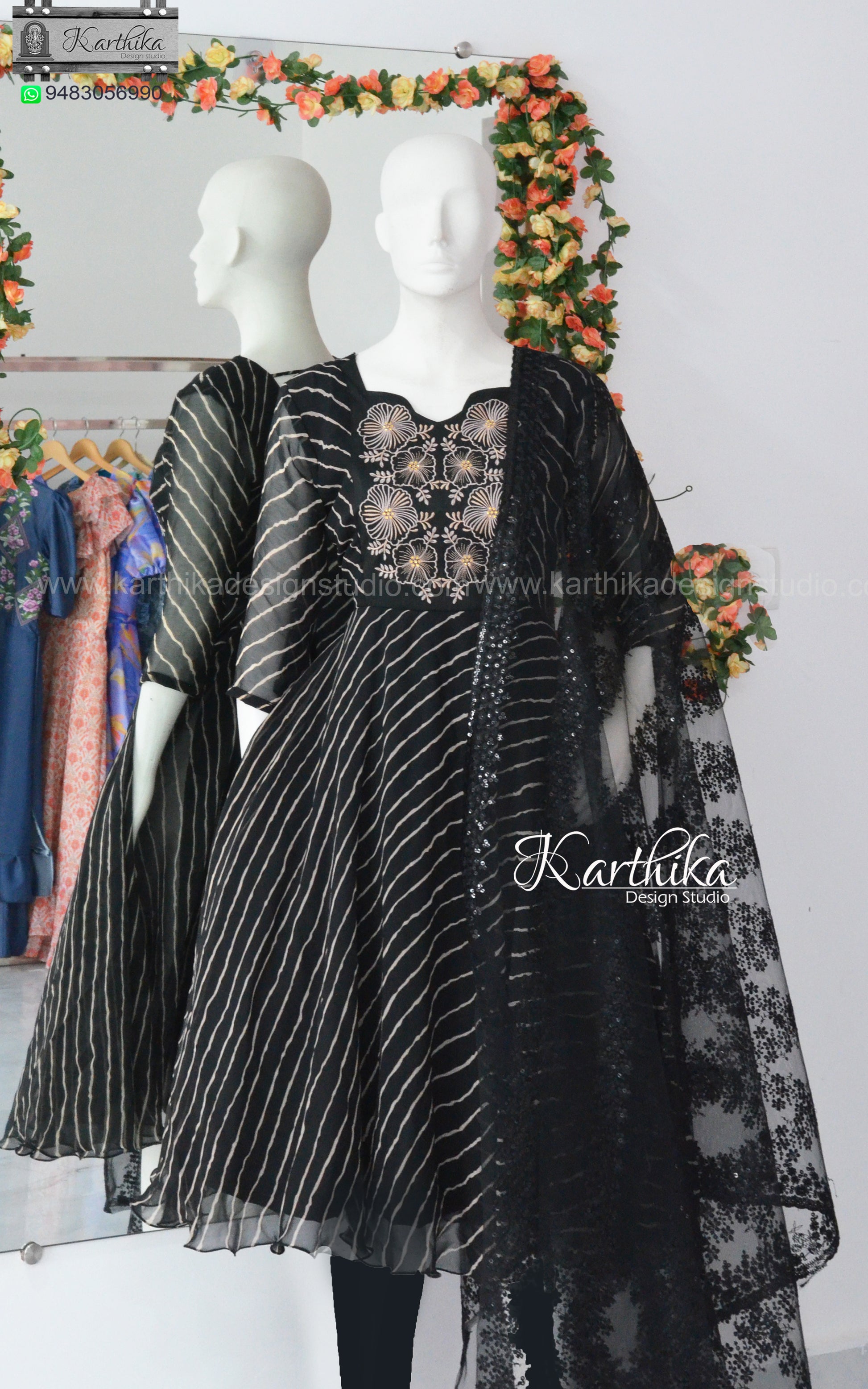 Black leheriya georgette chudidhar with embroidered net dupatta