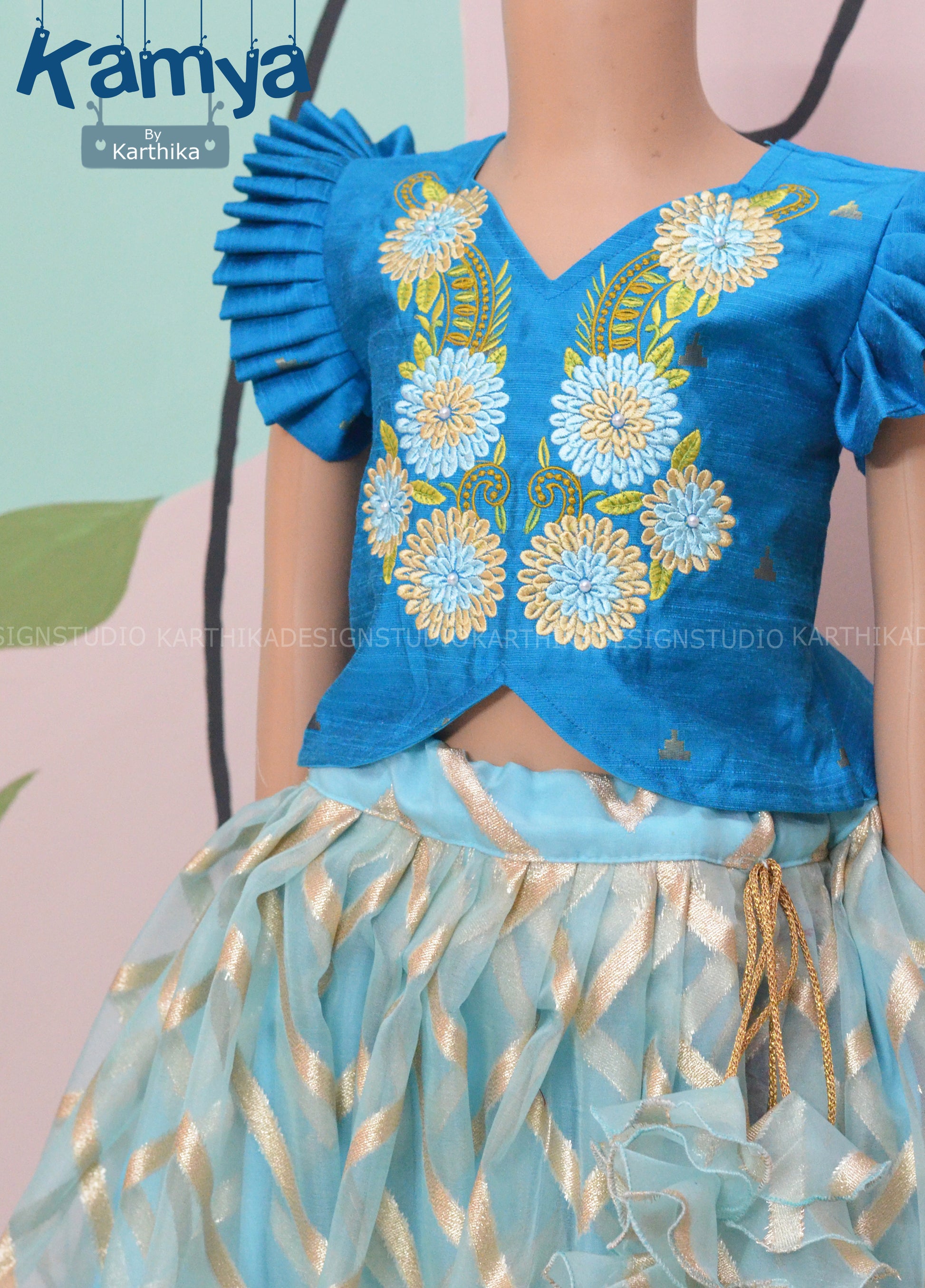 Blue organza crop top skirt.