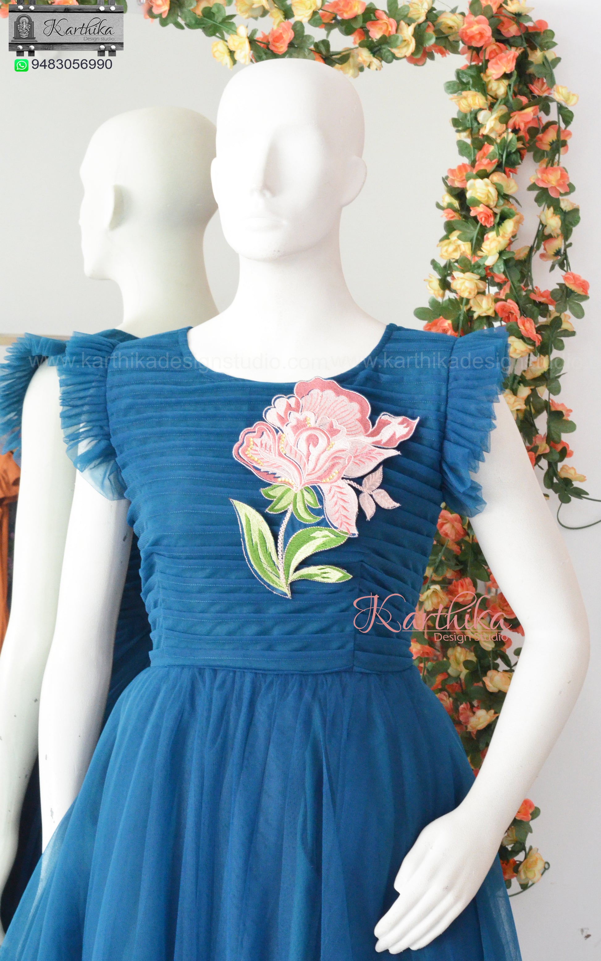 Embroidered Teal blue net long gown..