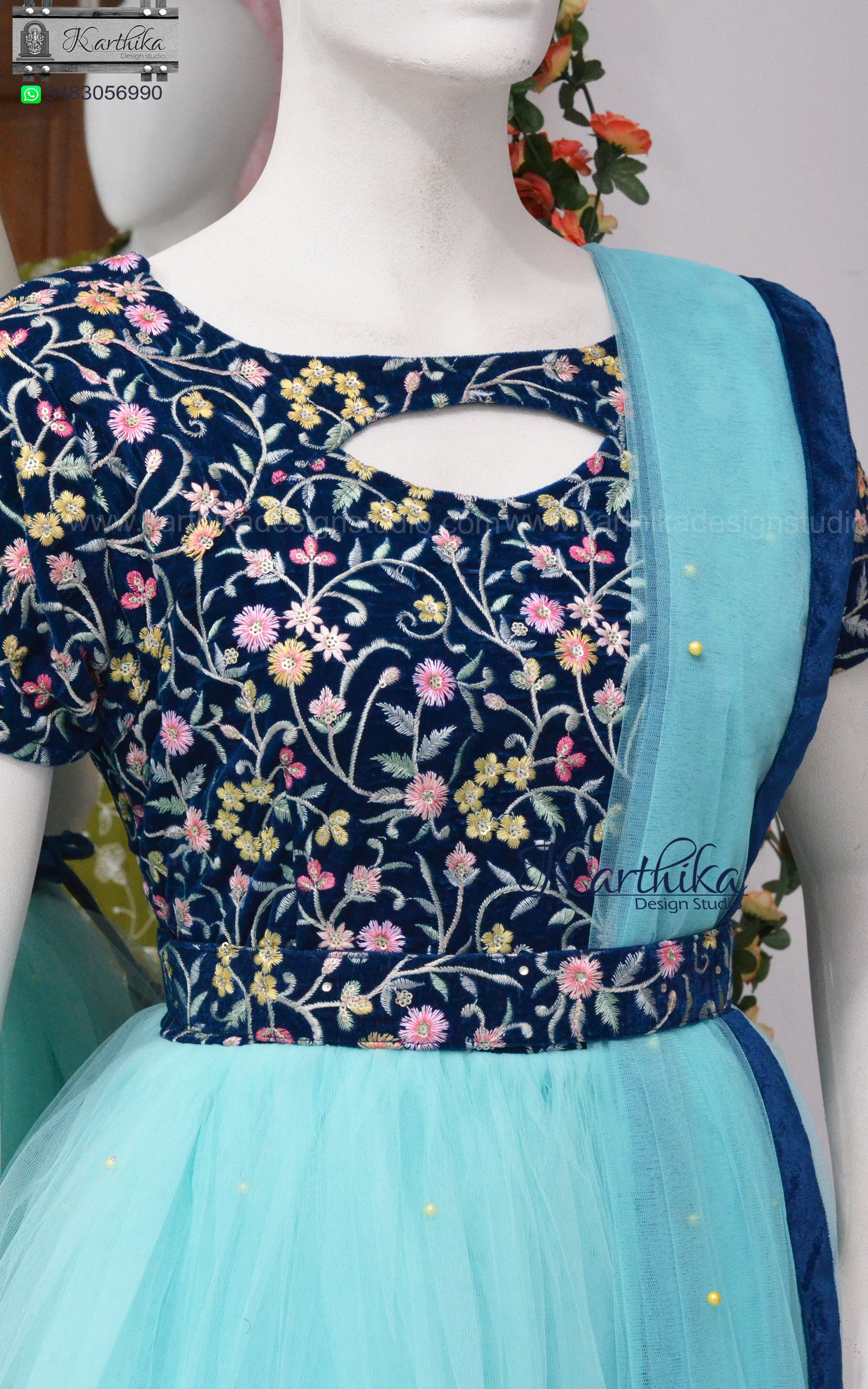 Embroidered velvet and net long gown with belt and dupatta.